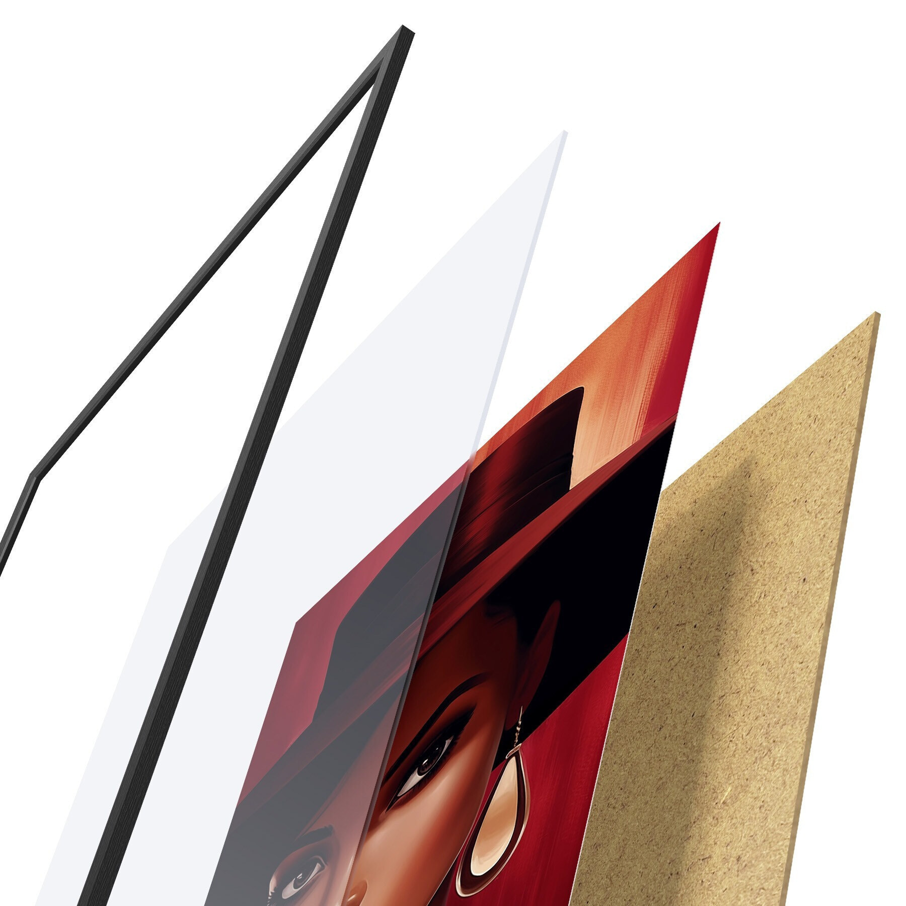 Plagát sa skladá z rámu, plexiskla, vytlačeného obrazu a podkladu z drevotriesky. Plagát možno okamžite zavesiť na stenu vďaka úchytom na zadnej strane.