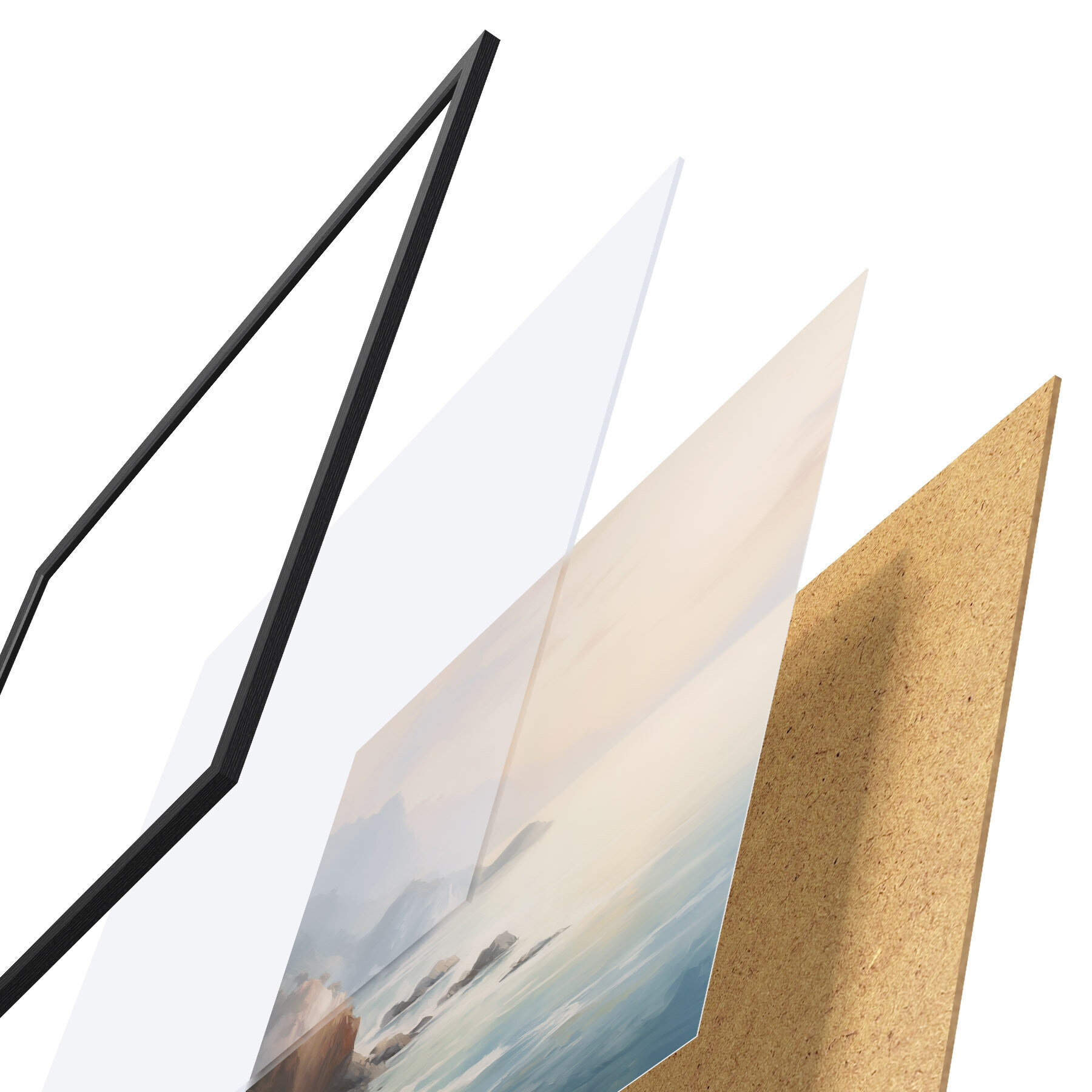 Plagát sa skladá z rámu, plexiskla, vytlačeného obrazu a podkladu z drevotriesky. Plagát možno okamžite zavesiť na stenu vďaka úchytom na zadnej strane.