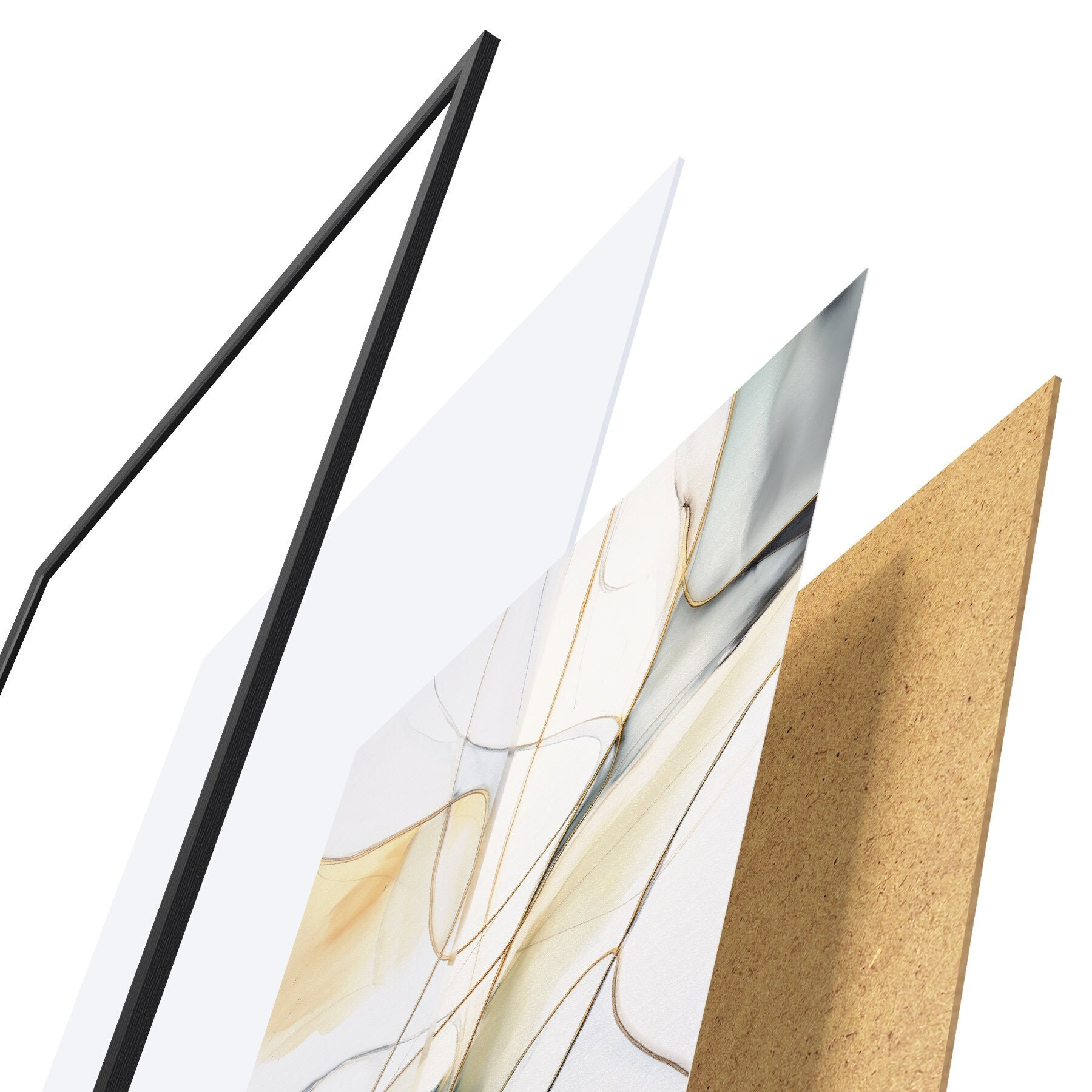 Plagát sa skladá z rámu, plexiskla, vytlačeného obrazu a podkladu z drevotriesky. Plagát možno okamžite zavesiť na stenu vďaka úchytom na zadnej strane.