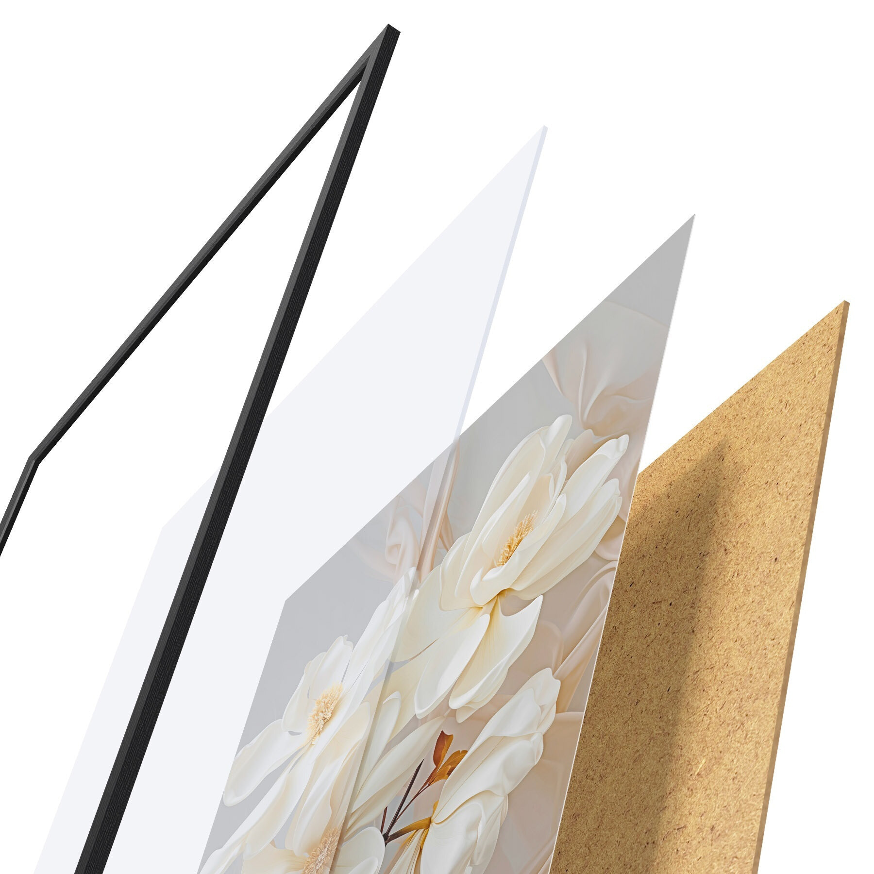 Plagát sa skladá z rámu, plexiskla, vytlačeného obrazu a podkladu z drevotriesky. Plagát možno okamžite zavesiť na stenu vďaka úchytom na zadnej strane.