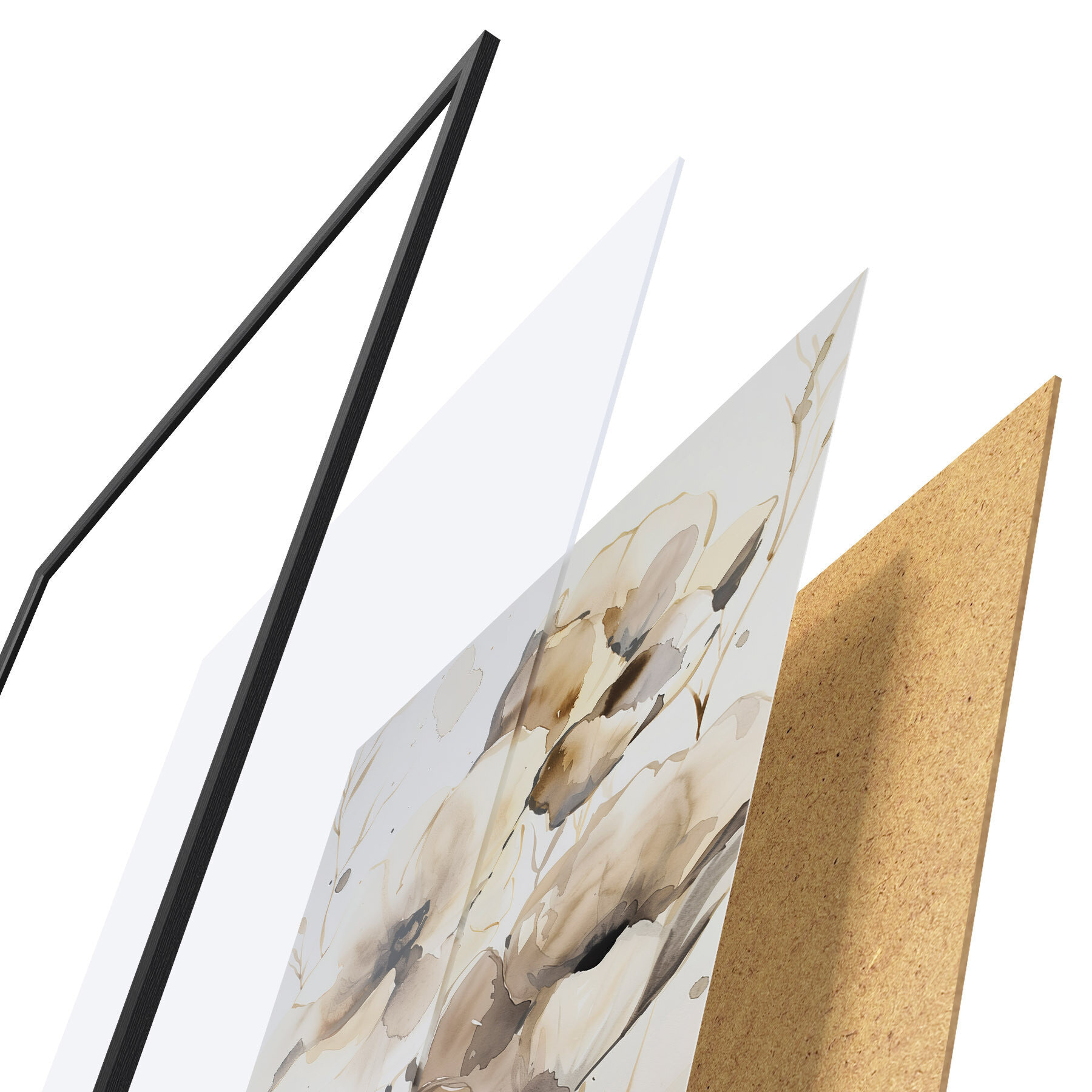 Plagát sa skladá z rámu, plexiskla, vytlačeného obrazu a podkladu z drevotriesky. Plagát možno okamžite zavesiť na stenu vďaka úchytom na zadnej strane.