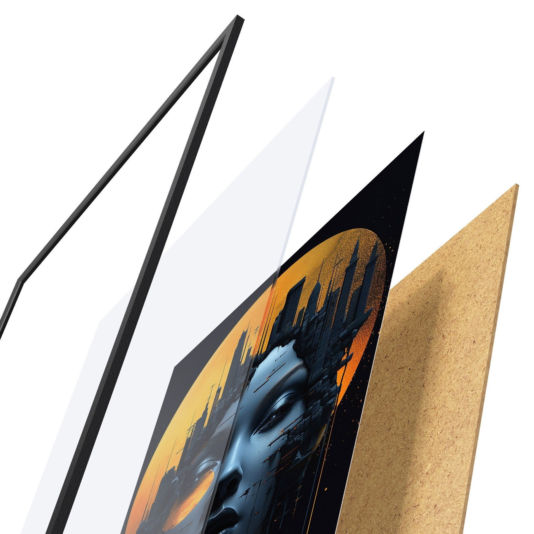 Plagát sa skladá z rámu, plexiskla, vytlačeného obrazu a podkladu z drevotriesky. Plagát možno okamžite zavesiť na stenu vďaka úchytom na zadnej strane.