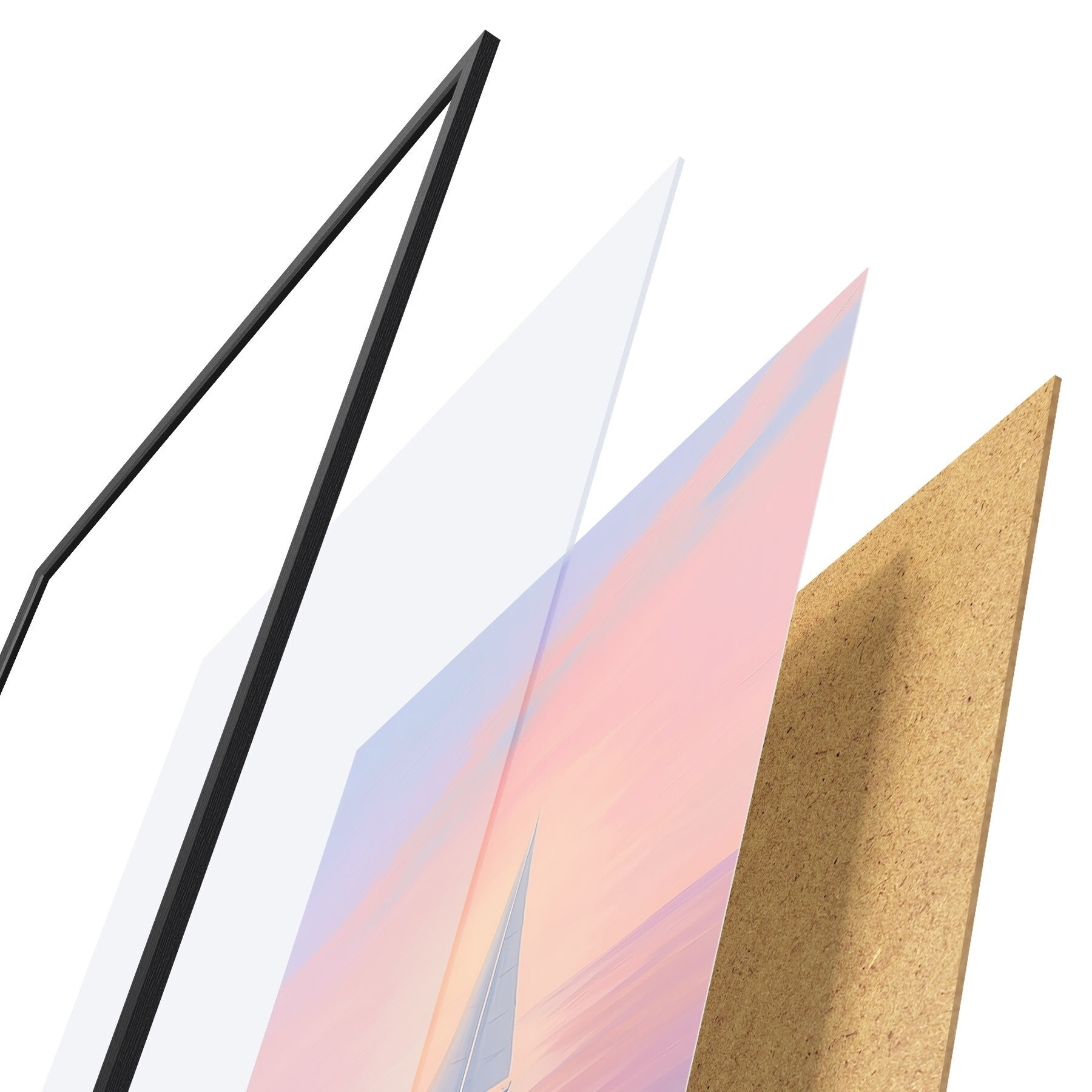 Plagát sa skladá z rámu, plexiskla, vytlačeného obrazu a podkladu z drevotriesky. Plagát možno okamžite zavesiť na stenu vďaka úchytom na zadnej strane.