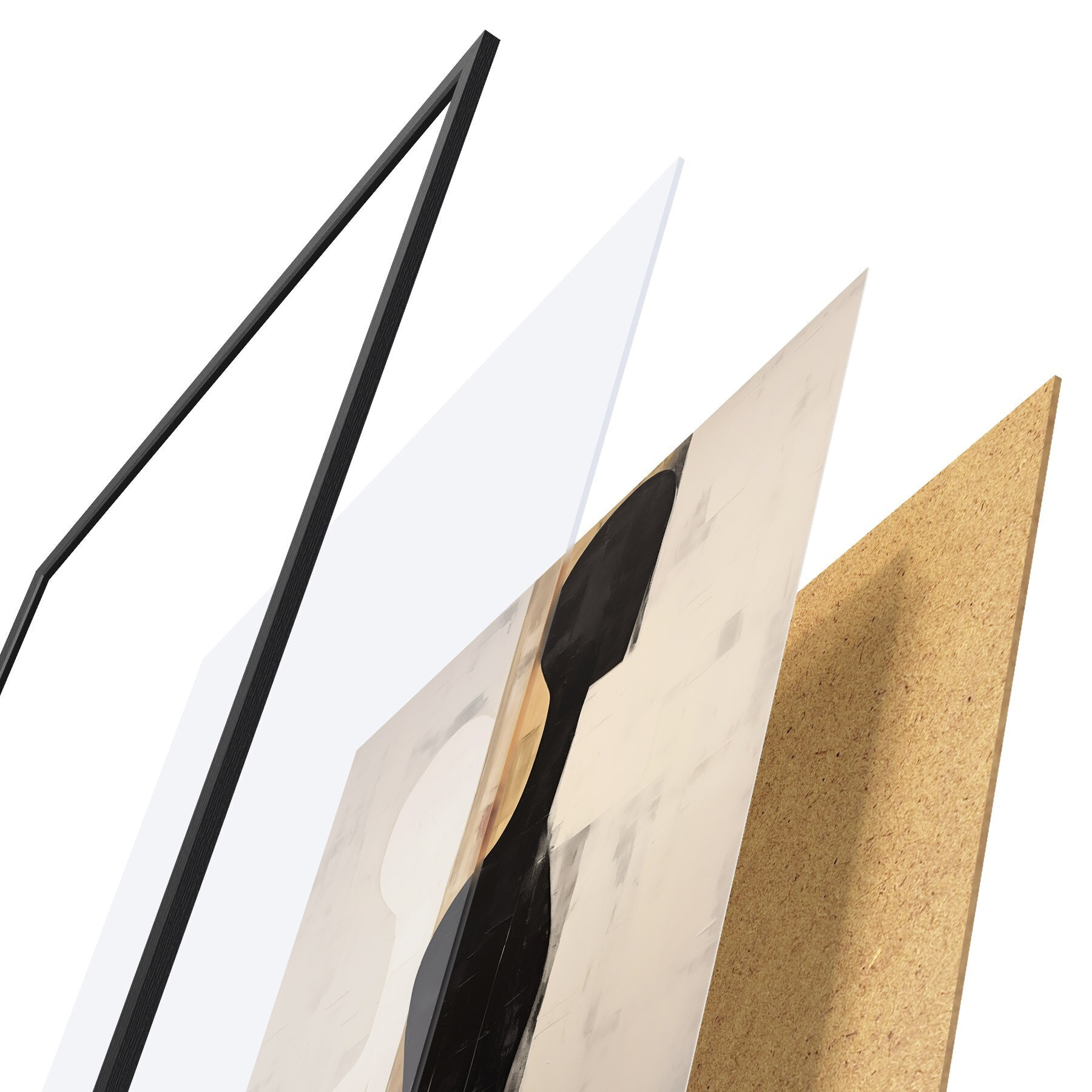 Plagát sa skladá z rámu, plexiskla, vytlačeného obrazu a podkladu z drevotriesky. Plagát možno okamžite zavesiť na stenu vďaka úchytom na zadnej strane.