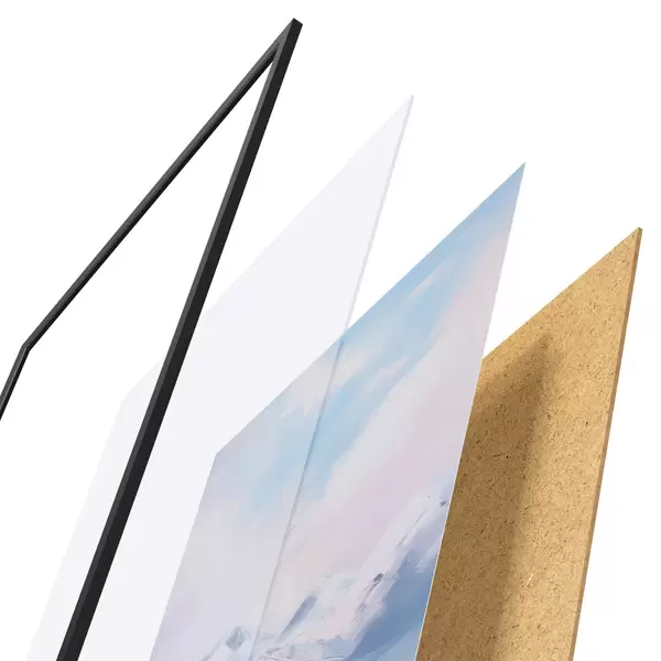 Plagát sa skladá z rámu, plexiskla, vytlačeného obrazu a podkladu z drevotriesky. Plagát možno okamžite zavesiť na stenu vďaka úchytom na zadnej strane.