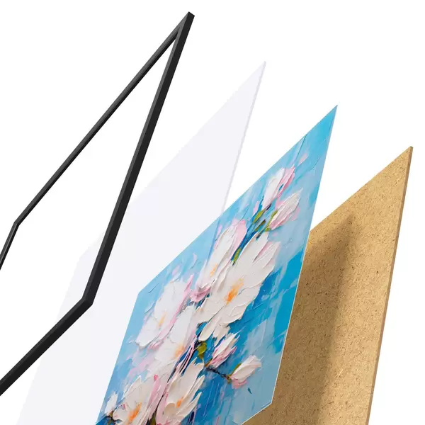 Plagát sa skladá z rámu, plexiskla, vytlačeného obrazu a podkladu z drevotriesky. Plagát možno okamžite zavesiť na stenu vďaka úchytom na zadnej strane.