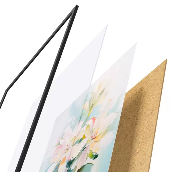 Plagát sa skladá z rámu, plexiskla, vytlačeného obrazu a podkladu z drevotriesky. Plagát možno okamžite zavesiť na stenu vďaka úchytom na zadnej strane.