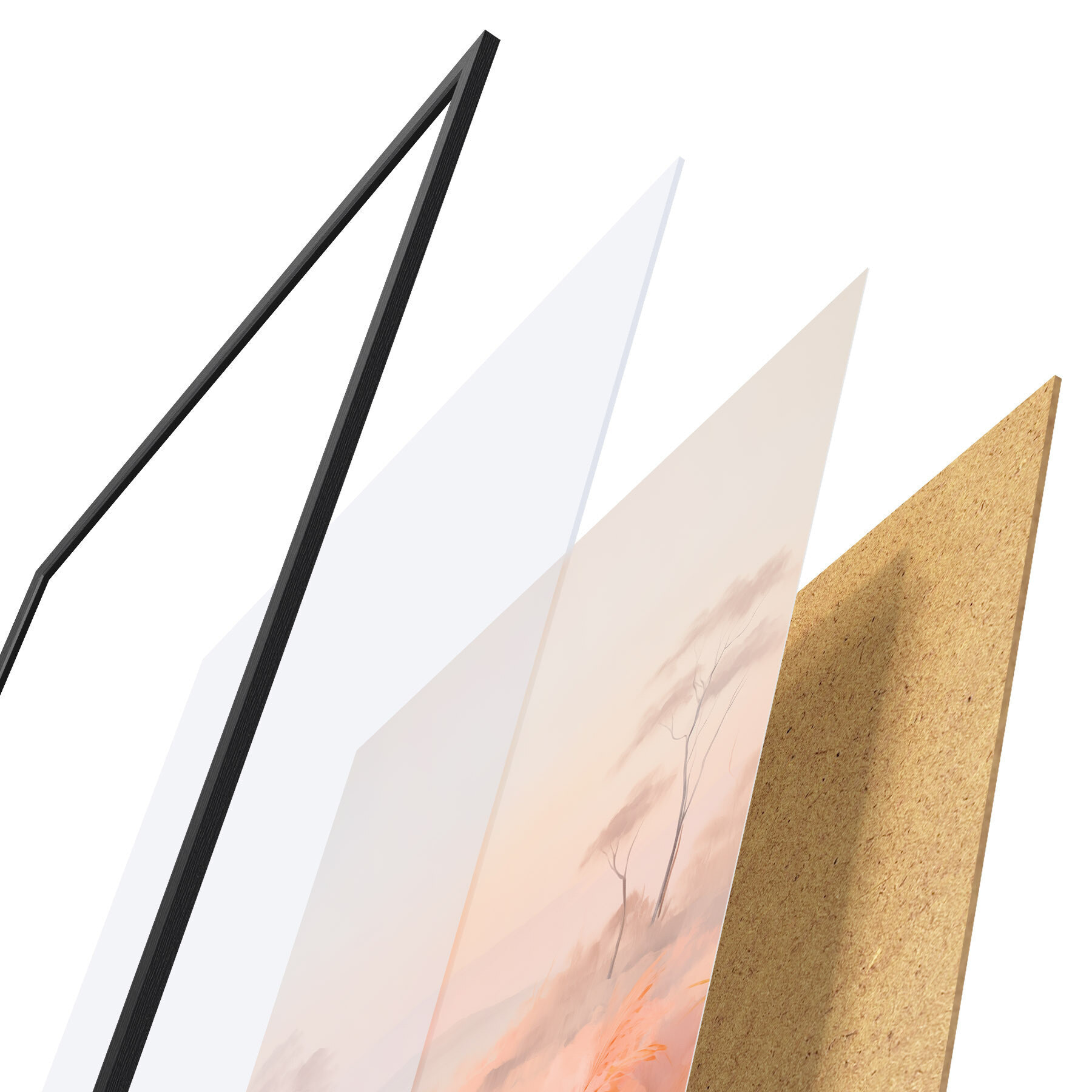 Plagát sa skladá z rámu, plexiskla, vytlačeného obrazu a podkladu z drevotriesky. Plagát možno okamžite zavesiť na stenu vďaka úchytom na zadnej strane.