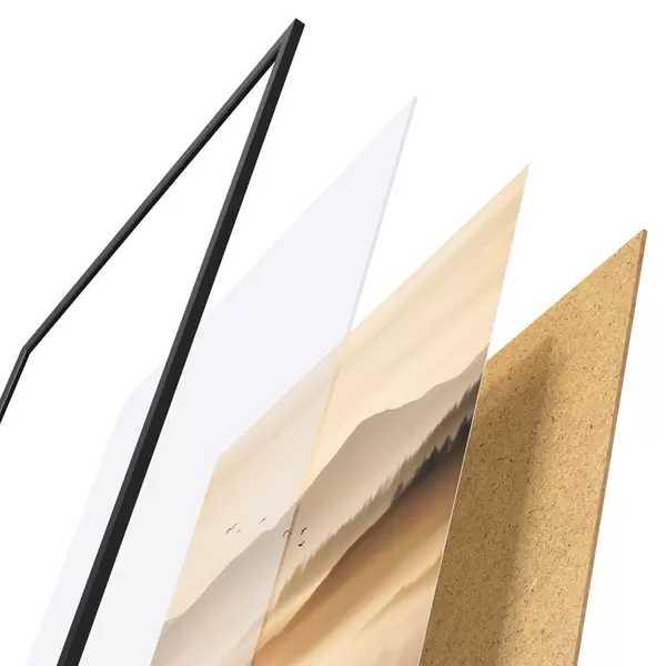 Plagát sa skladá z rámu, plexiskla, vytlačeného obrazu a podkladu z drevotriesky. Plagát možno okamžite zavesiť na stenu vďaka úchytom na zadnej strane.