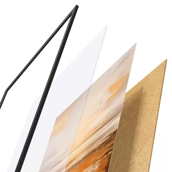 Plagát sa skladá z rámu, plexiskla, vytlačeného obrazu a podkladu z drevotriesky. Plagát možno okamžite zavesiť na stenu vďaka úchytom na zadnej strane.
