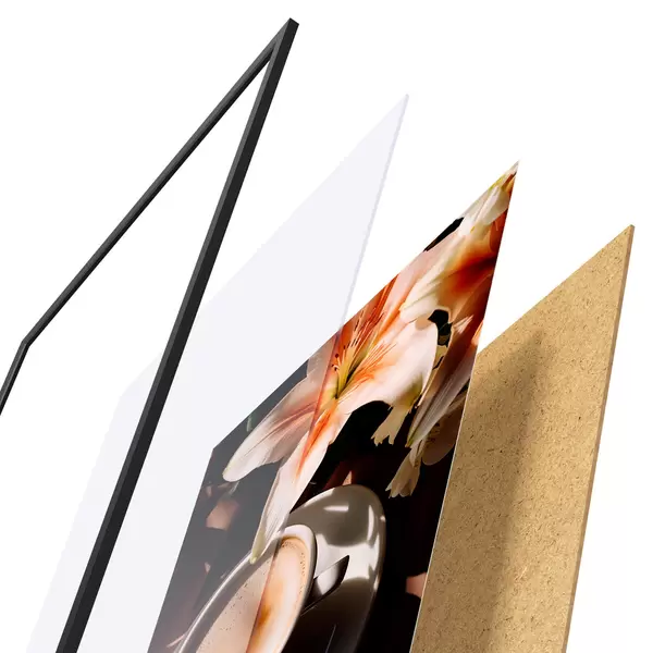 Plagát sa skladá z rámu, plexiskla, vytlačeného obrazu a podkladu z drevotriesky. Plagát možno okamžite zavesiť na stenu vďaka úchytom na zadnej strane.