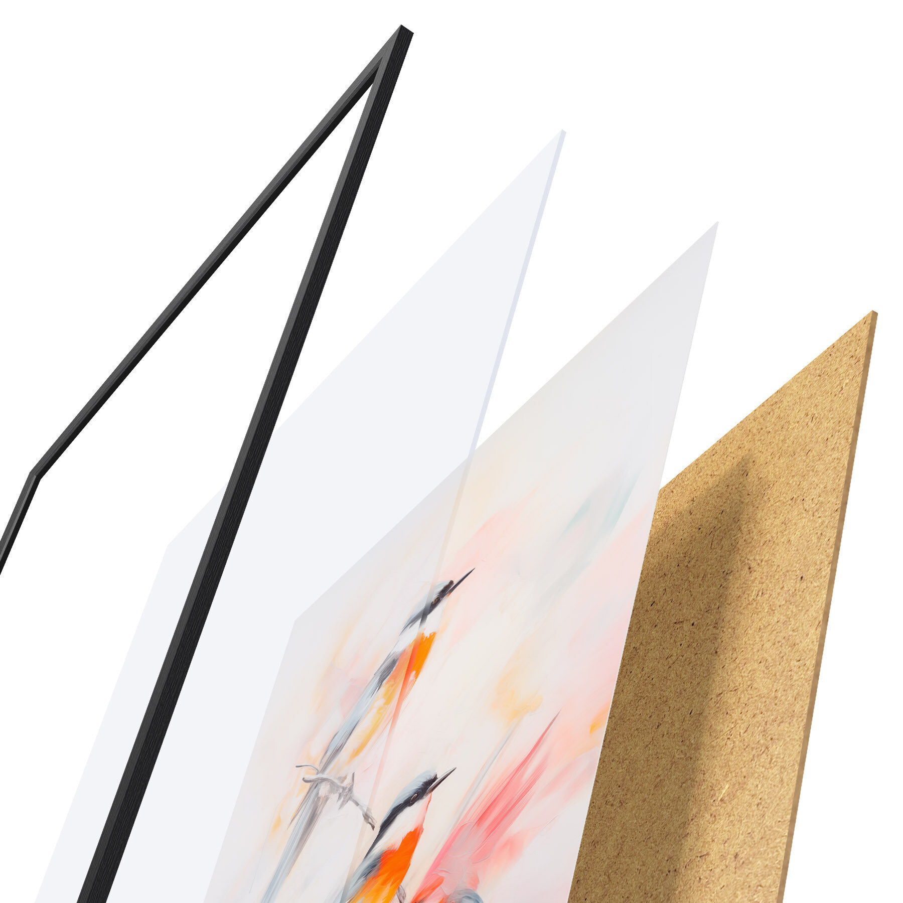 Plagát sa skladá z rámu, plexiskla, vytlačeného obrazu a podkladu z drevotriesky. Plagát možno okamžite zavesiť na stenu vďaka úchytom na zadnej strane.