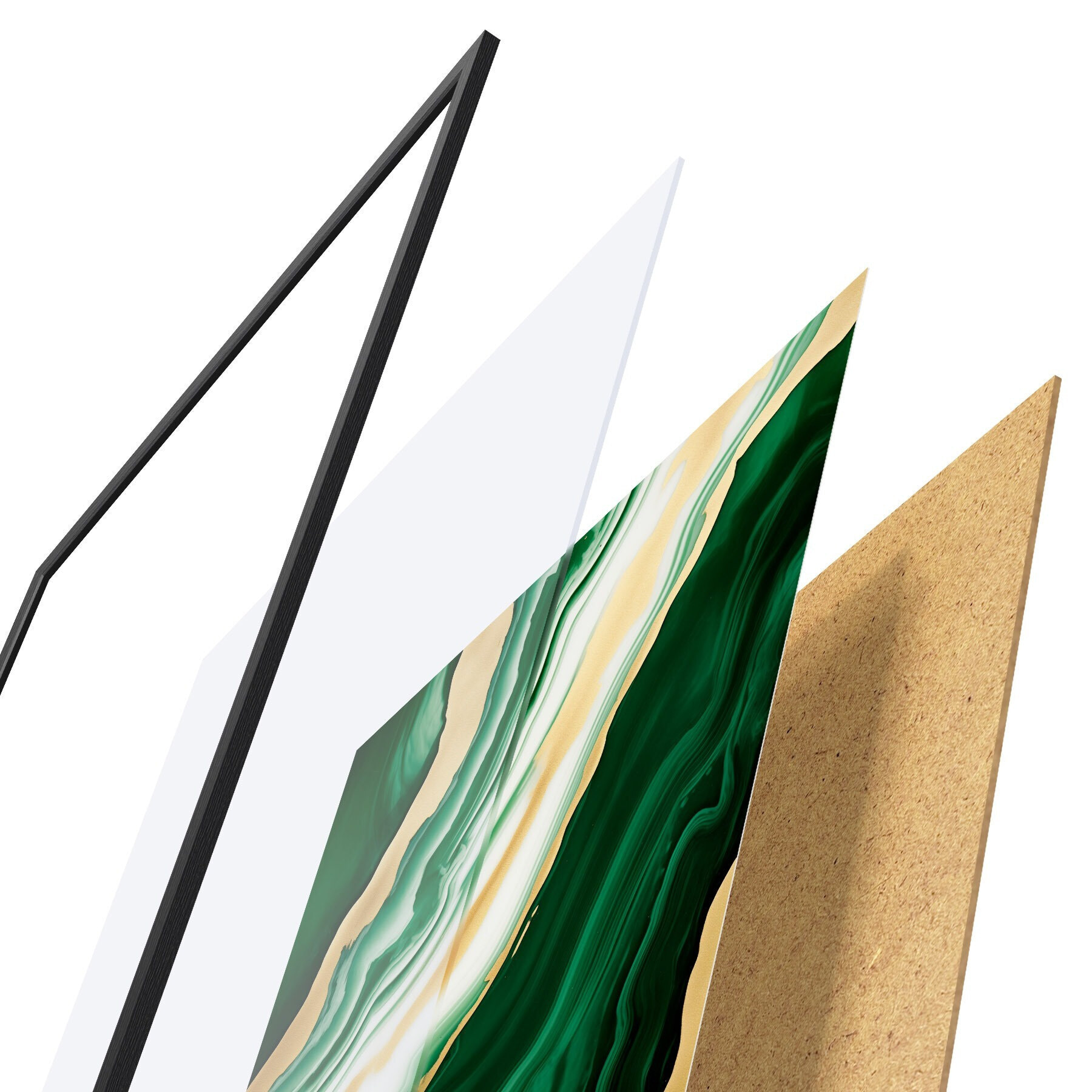 Plagát sa skladá z rámu, plexiskla, vytlačeného obrazu a podkladu z drevotriesky. Plagát možno okamžite zavesiť na stenu vďaka úchytom na zadnej strane.
