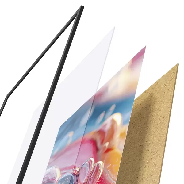 Plagát sa skladá z rámu, plexiskla, vytlačeného obrazu a podkladu z drevotriesky. Plagát možno okamžite zavesiť na stenu vďaka úchytom na zadnej strane.