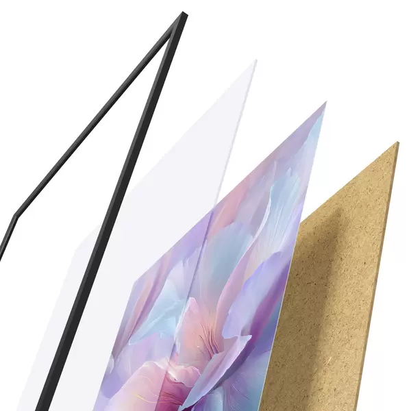 Plagát sa skladá z rámu, plexiskla, vytlačeného obrazu a podkladu z drevotriesky. Plagát možno okamžite zavesiť na stenu vďaka úchytom na zadnej strane.