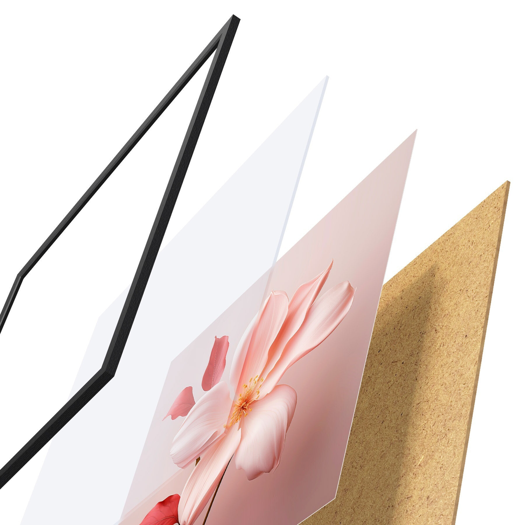 Plagát sa skladá z rámu, plexiskla, vytlačeného obrazu a podkladu z drevotriesky. Plagát možno okamžite zavesiť na stenu vďaka úchytom na zadnej strane.