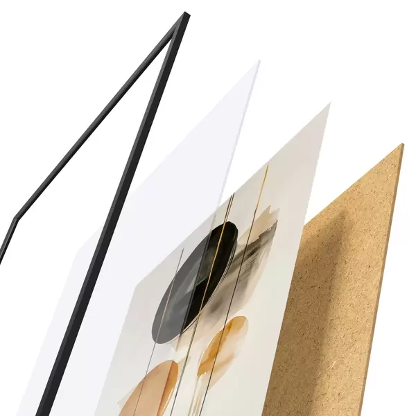 Plagát sa skladá z rámu, plexiskla, vytlačeného obrazu a podkladu z drevotriesky. Plagát možno okamžite zavesiť na stenu vďaka úchytom na zadnej strane.