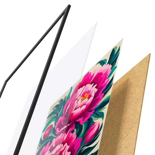 Plagát sa skladá z rámu, plexiskla, vytlačeného obrazu a podkladu z drevotriesky. Plagát možno okamžite zavesiť na stenu vďaka úchytom na zadnej strane.