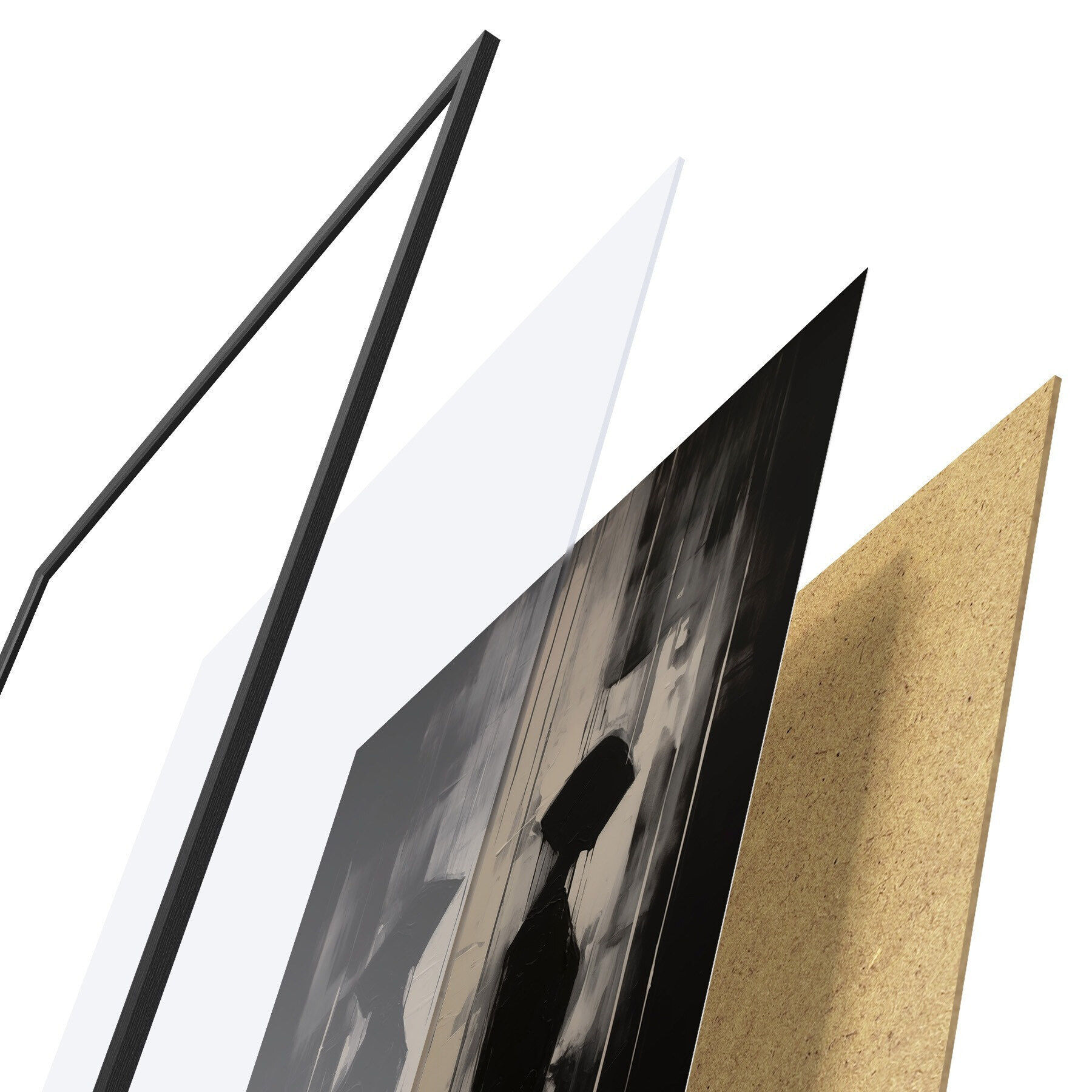 Plagát sa skladá z rámu, plexiskla, vytlačeného obrazu a podkladu z drevotriesky. Plagát možno okamžite zavesiť na stenu vďaka úchytom na zadnej strane.
