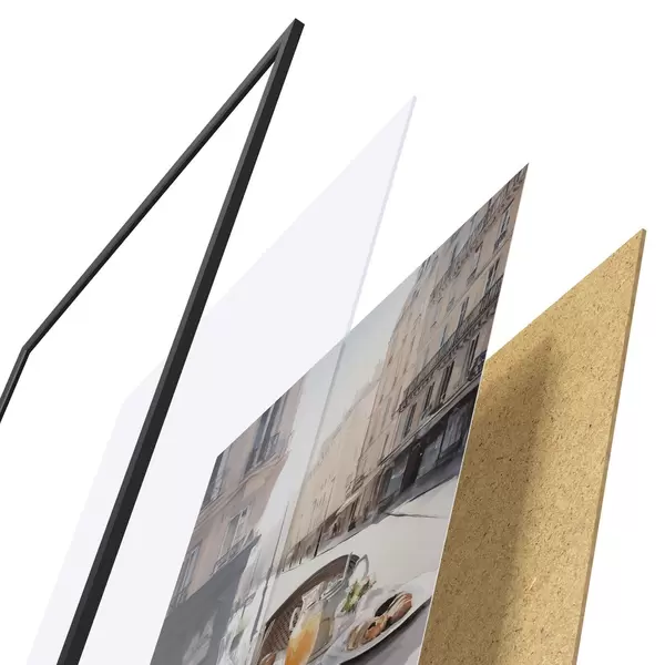 Plagát sa skladá z rámu, plexiskla, vytlačeného obrazu a podkladu z drevotriesky. Plagát možno okamžite zavesiť na stenu vďaka úchytom na zadnej strane.