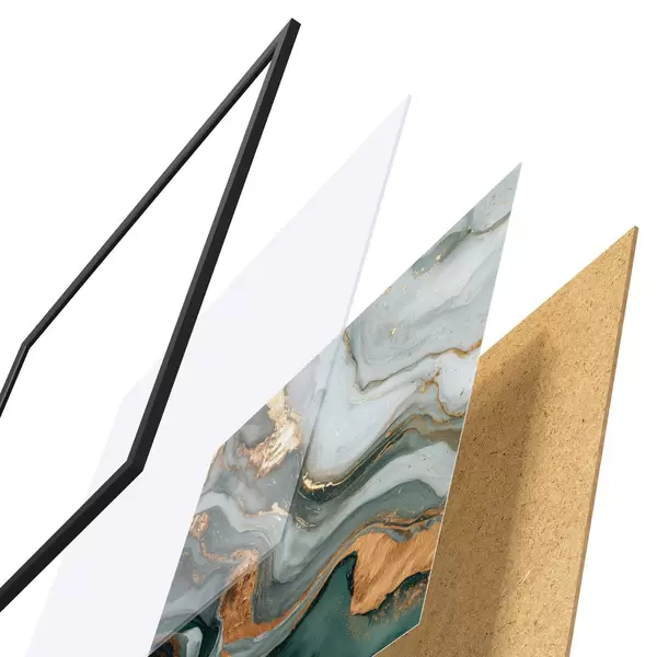 Plagát sa skladá z rámu, plexiskla, vytlačeného obrazu a podkladu z drevotriesky. Plagát možno okamžite zavesiť na stenu vďaka úchytom na zadnej strane.