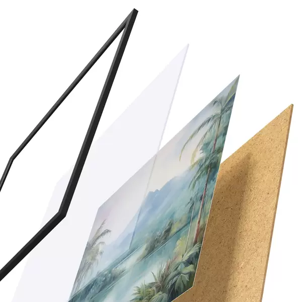 Plagát sa skladá z rámu, plexiskla, vytlačeného obrazu a podkladu z drevotriesky. Plagát možno okamžite zavesiť na stenu vďaka úchytom na zadnej strane.