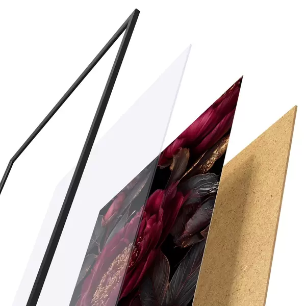 Plagát sa skladá z rámu, plexiskla, vytlačeného obrazu a podkladu z drevotriesky. Plagát možno okamžite zavesiť na stenu vďaka úchytom na zadnej strane.