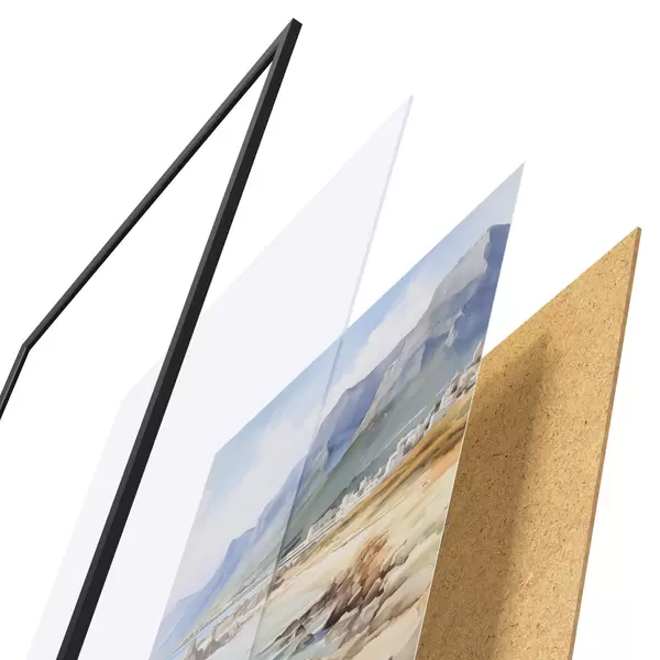 Plagát sa skladá z rámu, plexiskla, vytlačeného obrazu a podkladu z drevotriesky. Plagát možno okamžite zavesiť na stenu vďaka úchytom na zadnej strane.