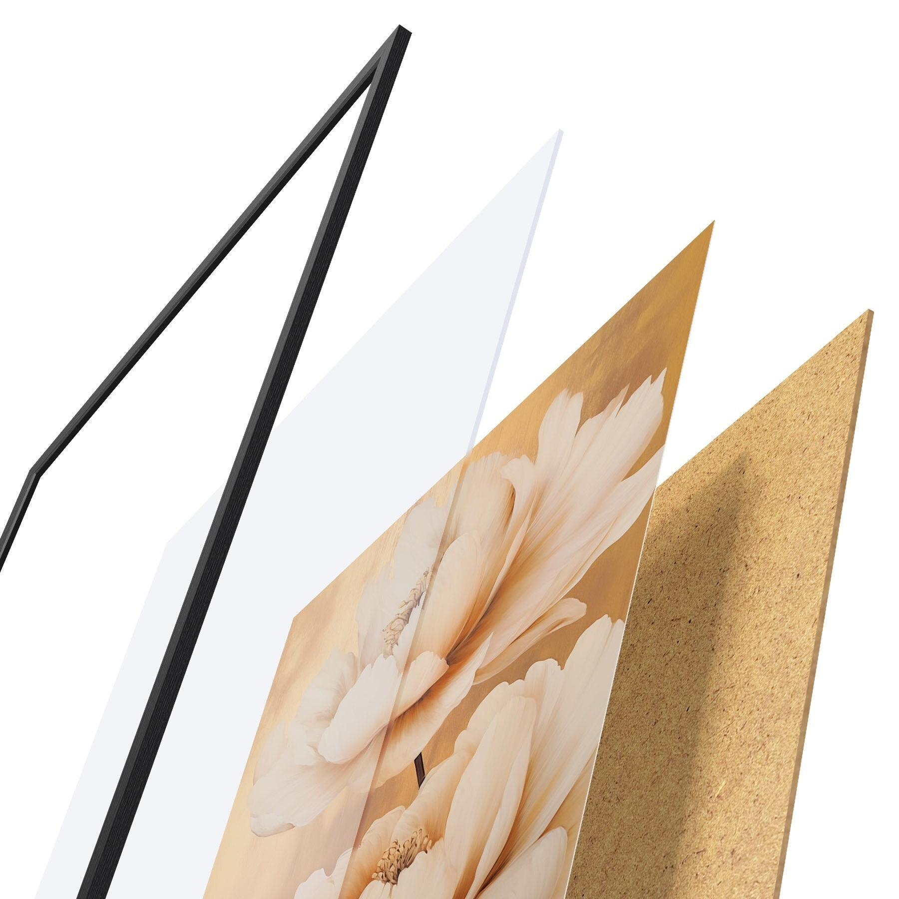 Plagát sa skladá z rámu, plexiskla, vytlačeného obrazu a podkladu z drevotriesky. Plagát možno okamžite zavesiť na stenu vďaka úchytom na zadnej strane.