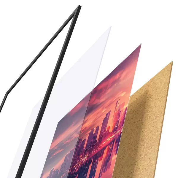 Plagát sa skladá z rámu, plexiskla, vytlačeného obrazu a podkladu z drevotriesky. Plagát možno okamžite zavesiť na stenu vďaka úchytom na zadnej strane.
