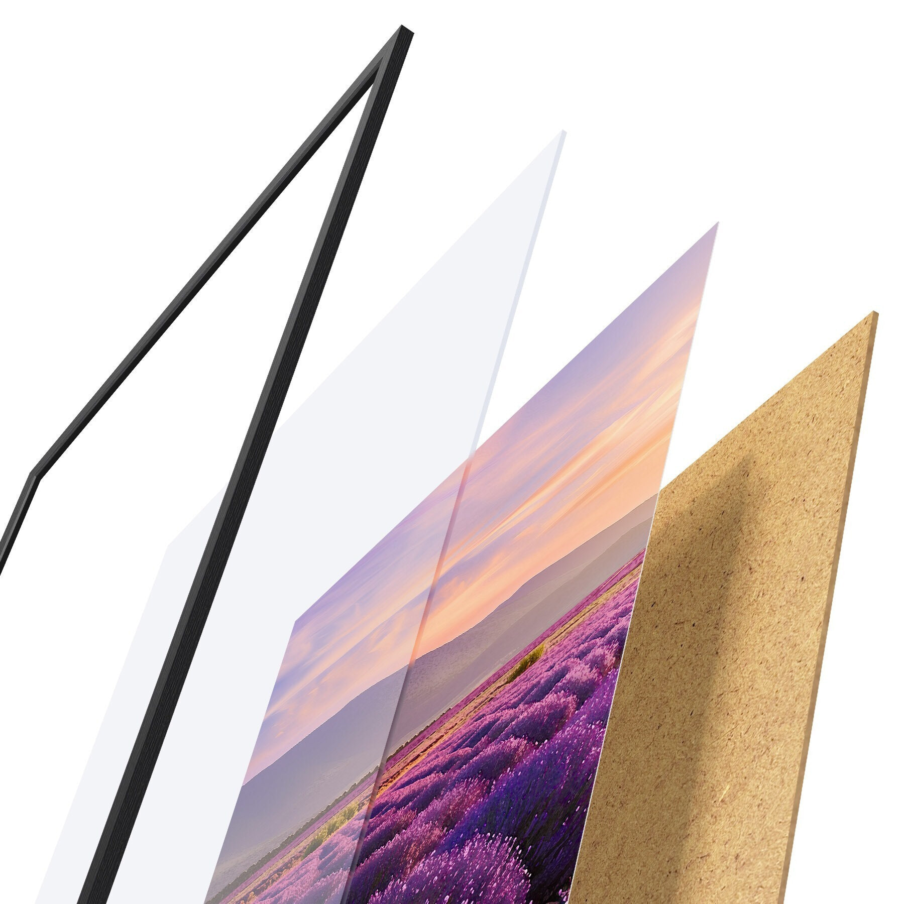 Plagát sa skladá z rámu, plexiskla, vytlačeného obrazu a podkladu z drevotriesky. Plagát možno okamžite zavesiť na stenu vďaka úchytom na zadnej strane.