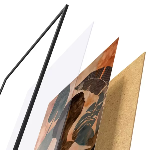 Plagát sa skladá z rámu, plexiskla, vytlačeného obrazu a podkladu z drevotriesky. Plagát možno okamžite zavesiť na stenu vďaka úchytom na zadnej strane.