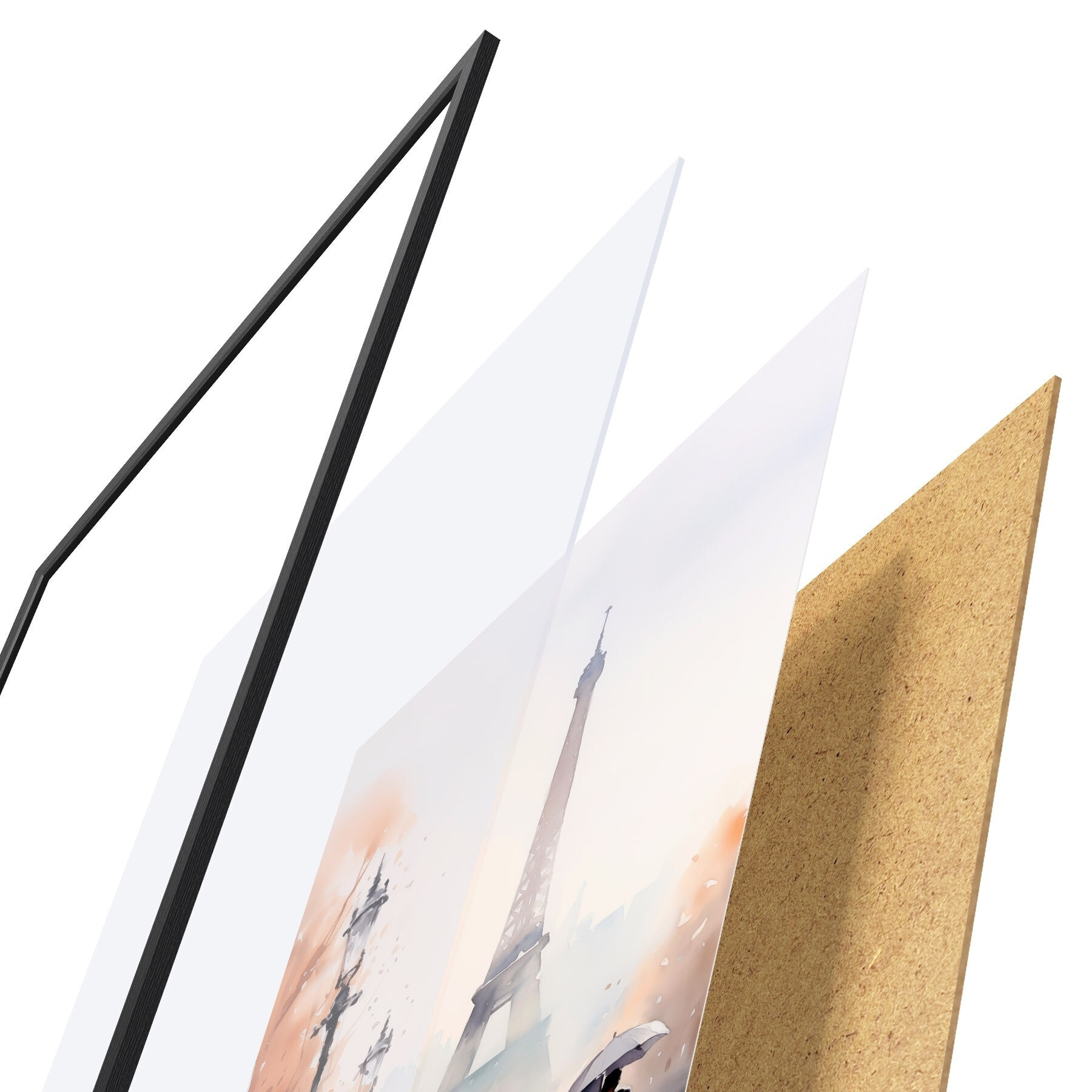 Plagát sa skladá z rámu, plexiskla, vytlačeného obrazu a podkladu z drevotriesky. Plagát možno okamžite zavesiť na stenu vďaka úchytom na zadnej strane.