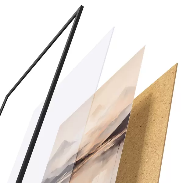 Plagát sa skladá z rámu, plexiskla, vytlačeného obrazu a podkladu z drevotriesky. Plagát možno okamžite zavesiť na stenu vďaka úchytom na zadnej strane.