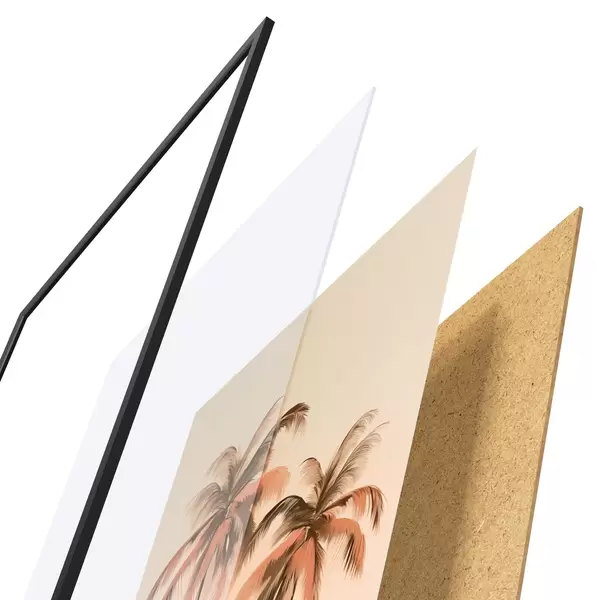 Plagát sa skladá z rámu, plexiskla, vytlačeného obrazu a podkladu z drevotriesky. Plagát možno okamžite zavesiť na stenu vďaka úchytom na zadnej strane.