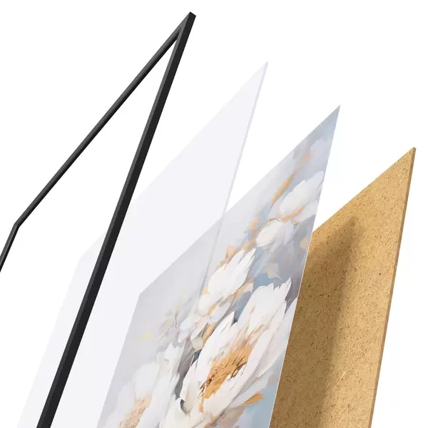 Plagát sa skladá z rámu, plexiskla, vytlačeného obrazu a podkladu z drevotriesky. Plagát možno okamžite zavesiť na stenu vďaka úchytom na zadnej strane.