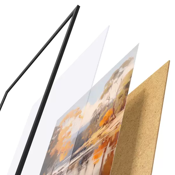 Plagát sa skladá z rámu, plexiskla, vytlačeného obrazu a podkladu z drevotriesky. Plagát možno okamžite zavesiť na stenu vďaka úchytom na zadnej strane.