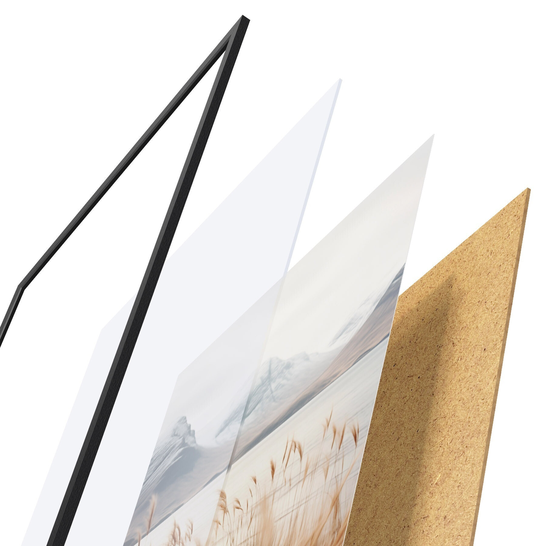 Plagát sa skladá z rámu, plexiskla, vytlačeného obrazu a podkladu z drevotriesky. Plagát možno okamžite zavesiť na stenu vďaka úchytom na zadnej strane.