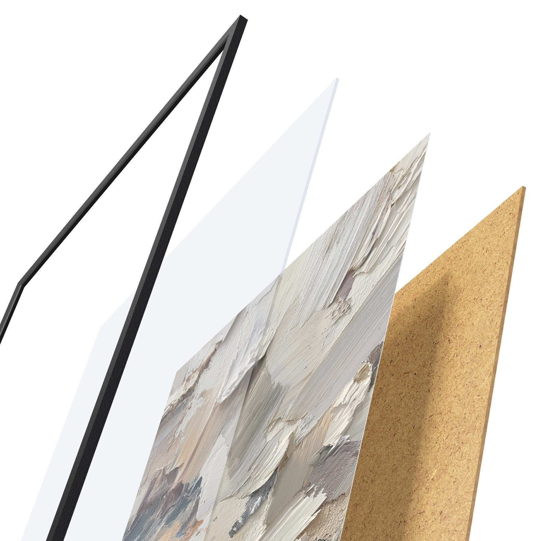 Plagát sa skladá z rámu, plexiskla, vytlačeného obrazu a podkladu z drevotriesky. Plagát možno okamžite zavesiť na stenu vďaka úchytom na zadnej strane.