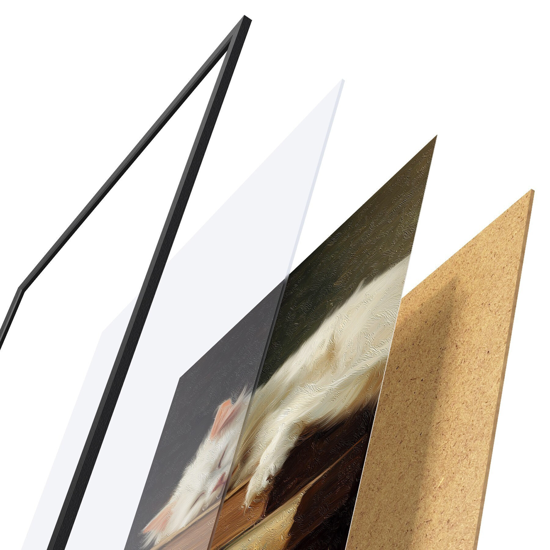 Plagát sa skladá z rámu, plexiskla, vytlačeného obrazu a podkladu z drevotriesky. Plagát možno okamžite zavesiť na stenu vďaka úchytom na zadnej strane.