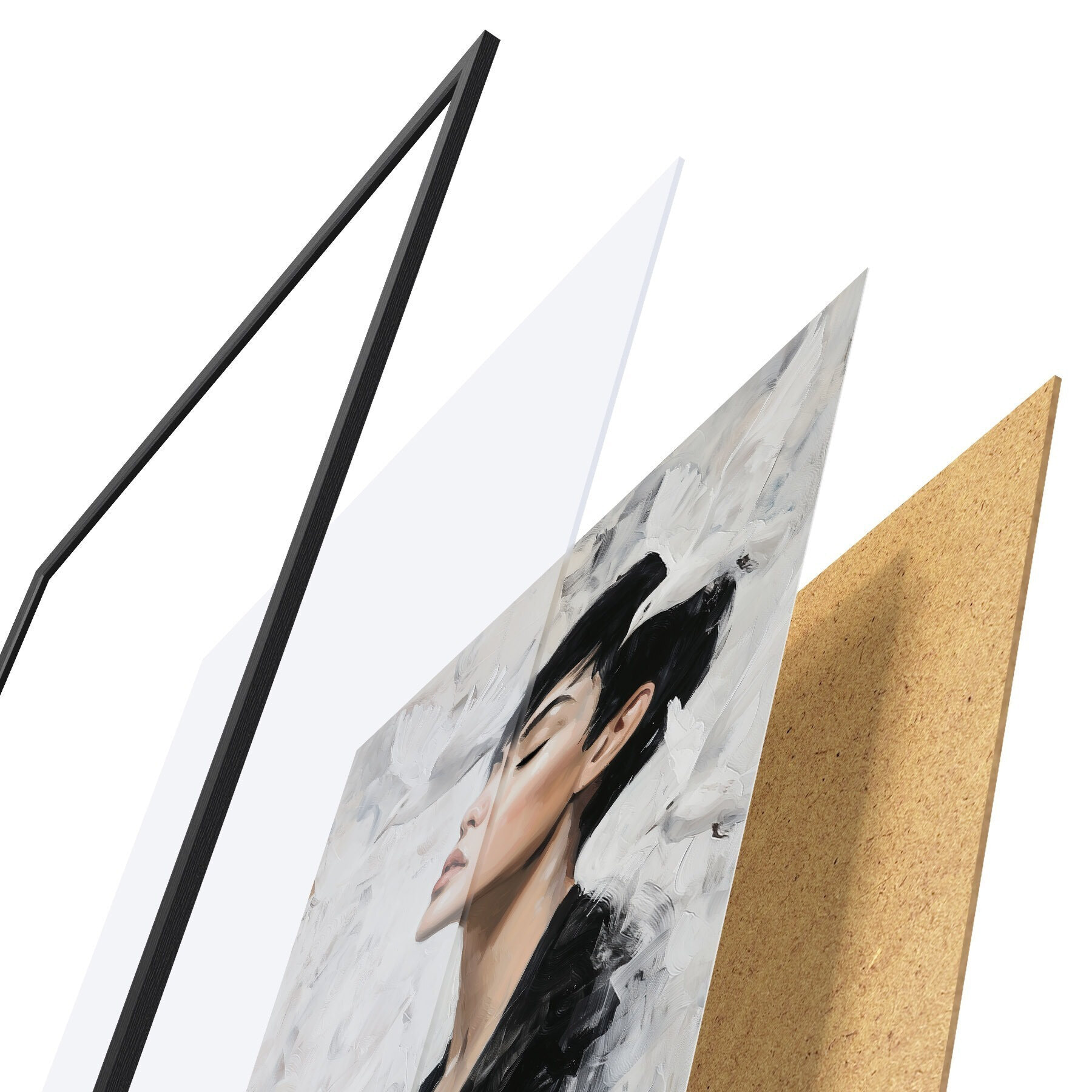 Plagát sa skladá z rámu, plexiskla, vytlačeného obrazu a podkladu z drevotriesky. Plagát možno okamžite zavesiť na stenu vďaka úchytom na zadnej strane.