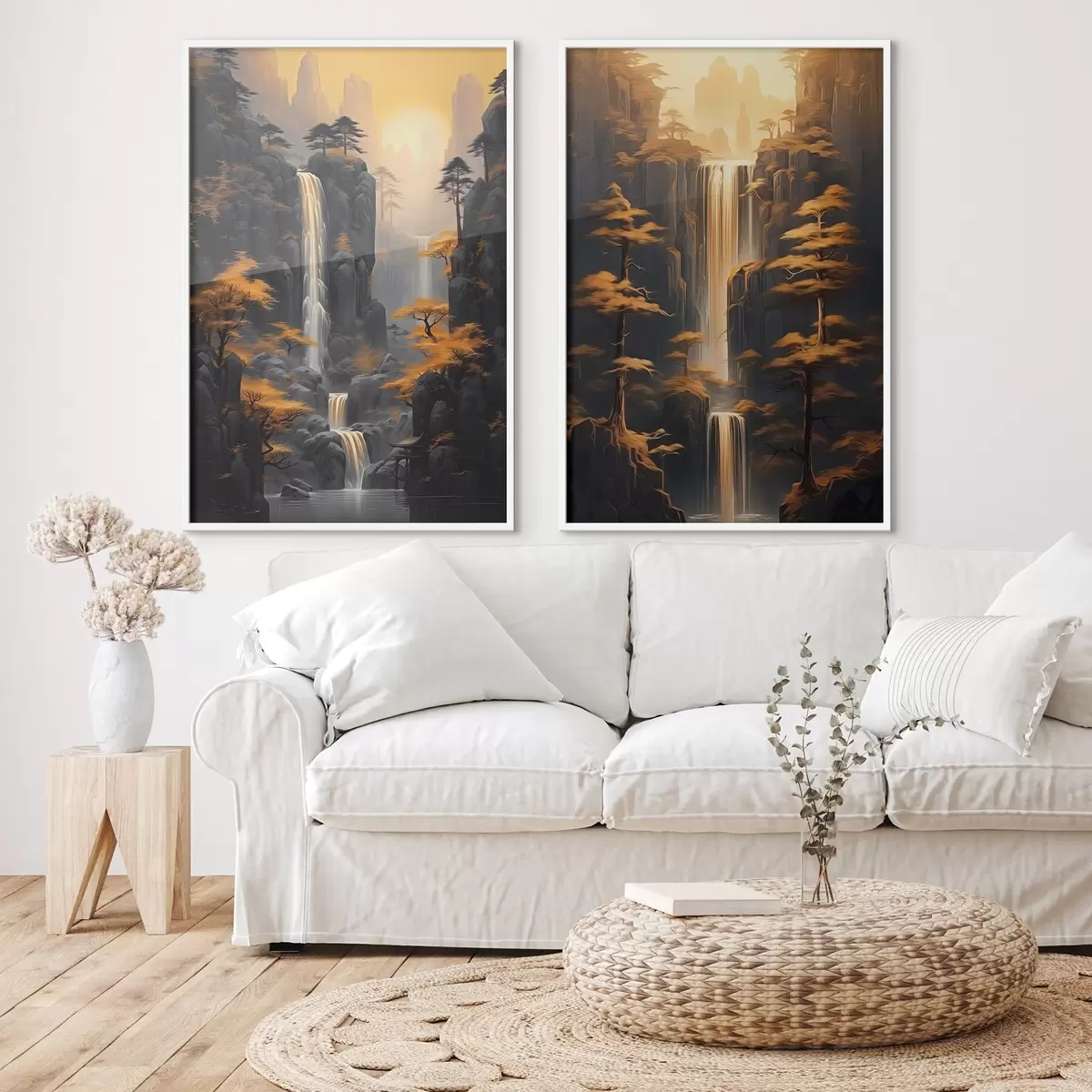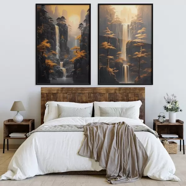 Plagáty Krajina s vodopádom a horami v zlatom svetle Nr d00928