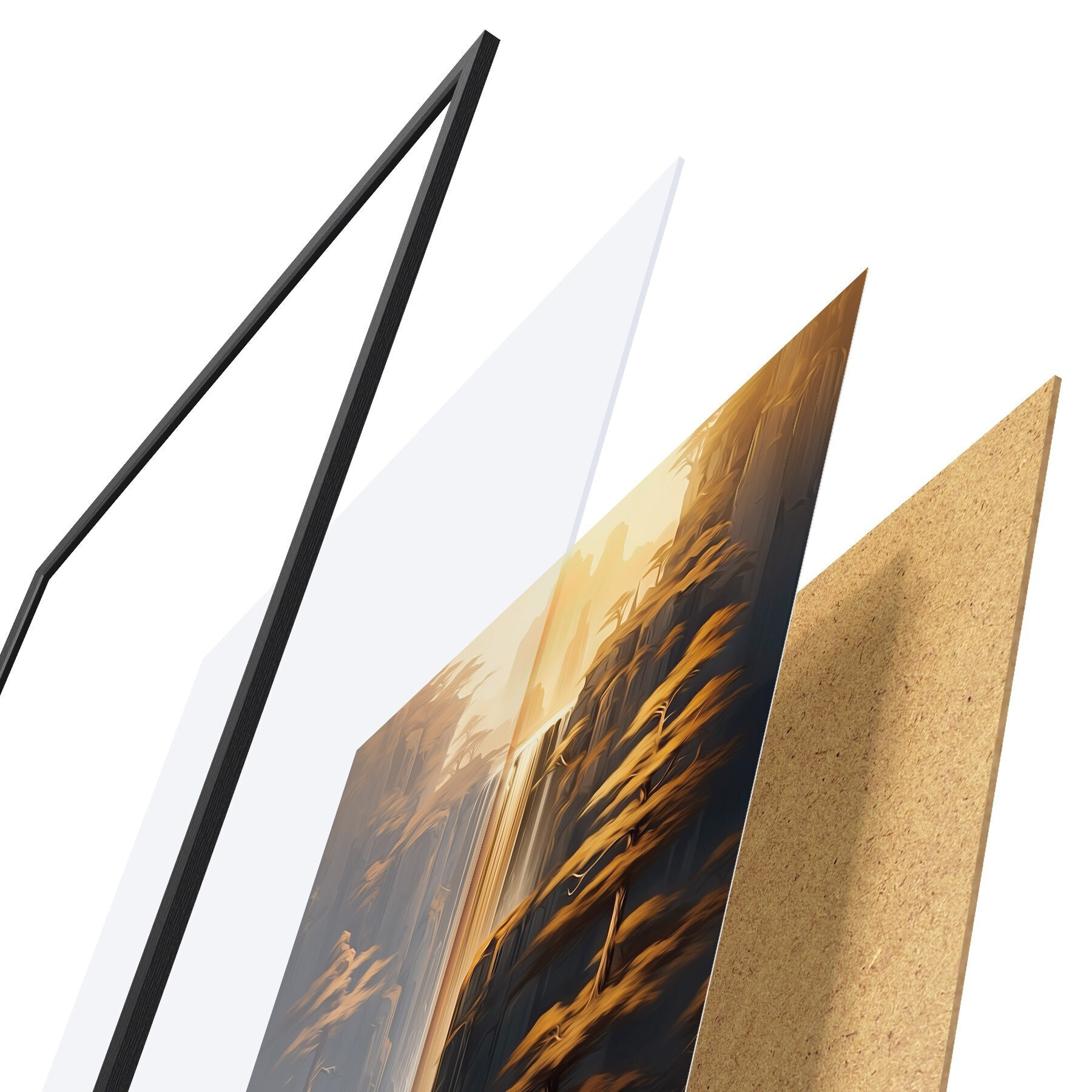 Plagát sa skladá z rámu, plexiskla, vytlačeného obrazu a podkladu z drevotriesky. Plagát možno okamžite zavesiť na stenu vďaka úchytom na zadnej strane.