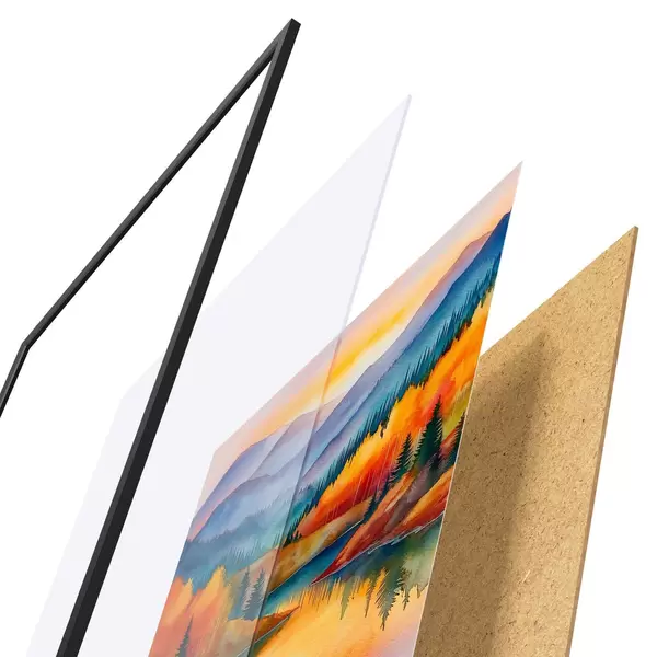 Plagát sa skladá z rámu, plexiskla, vytlačeného obrazu a podkladu z drevotriesky. Plagát možno okamžite zavesiť na stenu vďaka úchytom na zadnej strane.