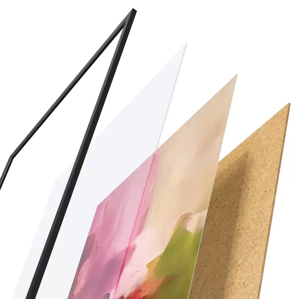 Plagát sa skladá z rámu, plexiskla, vytlačeného obrazu a podkladu z drevotriesky. Plagát možno okamžite zavesiť na stenu vďaka úchytom na zadnej strane.