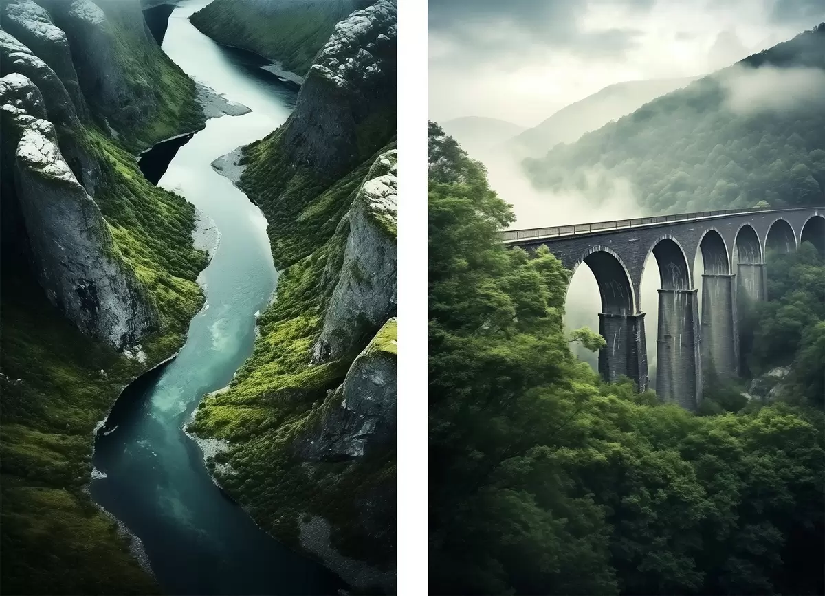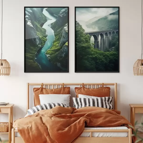 Plagáty Vzdušný riečny kaňon a hmlistý viadukt v zelených kopcoch Nr d00967