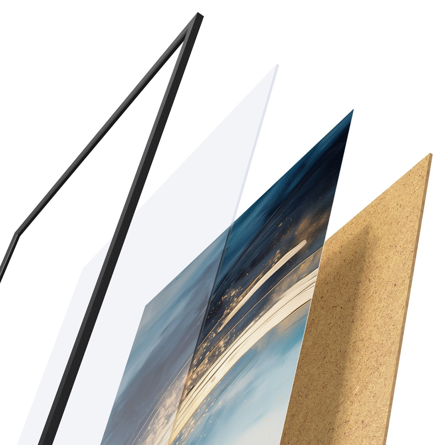Plagát sa skladá z rámu, plexiskla, vytlačeného obrazu a podkladu z drevotriesky. Plagát možno okamžite zavesiť na stenu vďaka úchytom na zadnej strane.