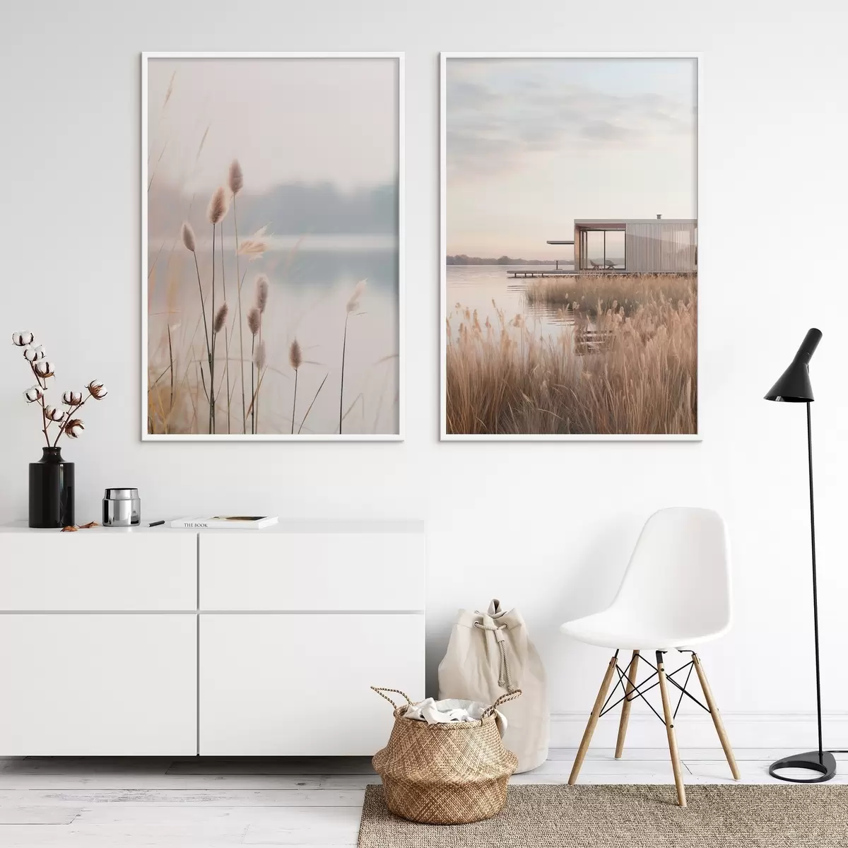 Plagáty Mäkké trstiny pri pokojnom jazere a moderná chata na brehu Nr d00970