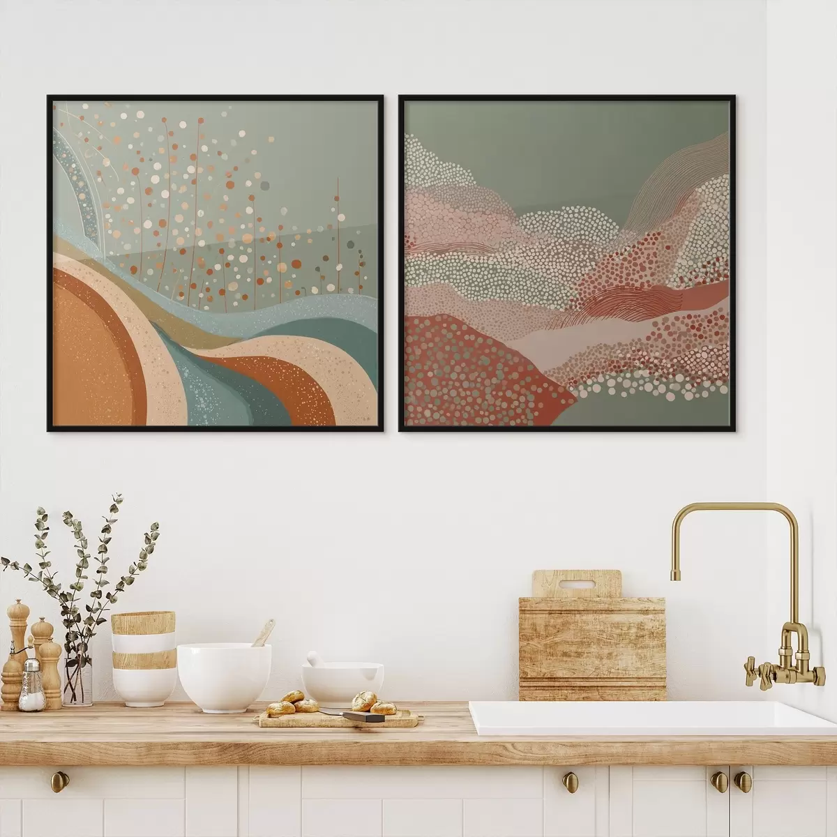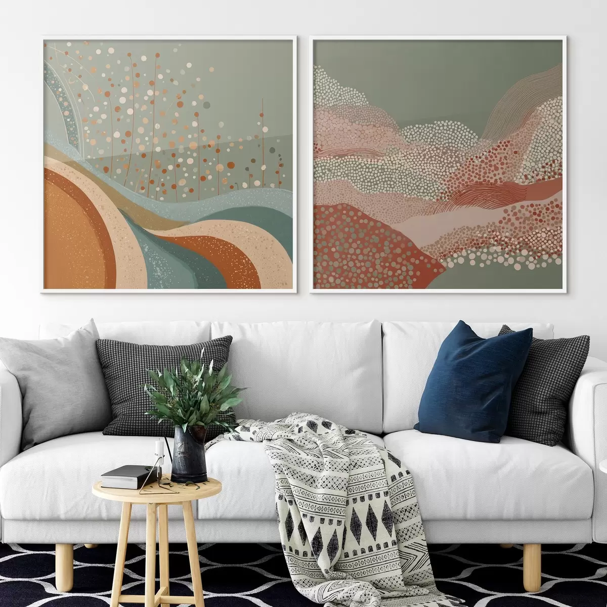 Plagáty Dvojdielna abstraktná krajina s bodkovanými a vlnitými prvkami Nr d00987