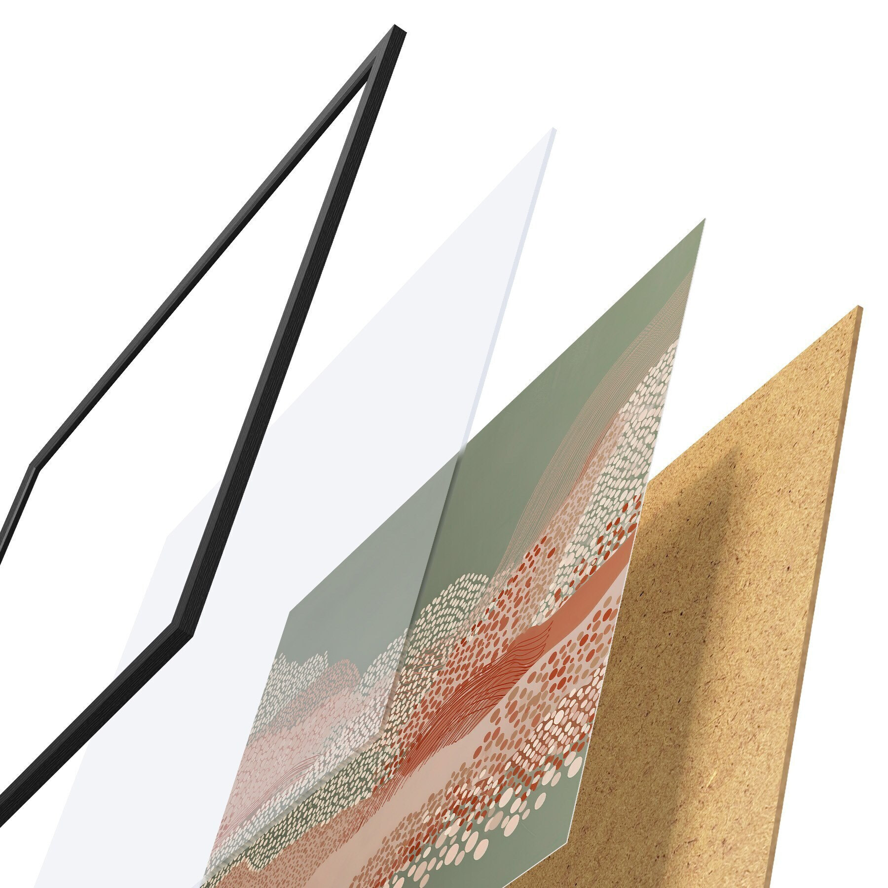 Plagát sa skladá z rámu, plexiskla, vytlačeného obrazu a podkladu z drevotriesky. Plagát možno okamžite zavesiť na stenu vďaka úchytom na zadnej strane.